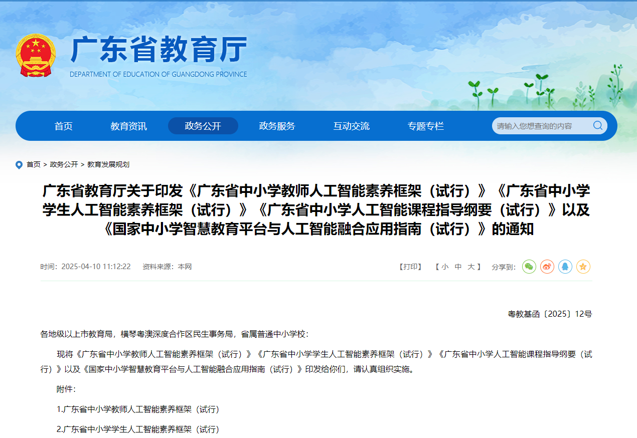 广东省教育厅印发中小学教师人工智能素养框架、中小学学生人工智能素养框架等通知