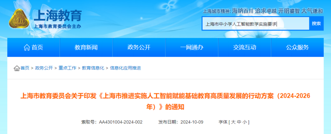 上海市教育委员会关于印发《上海市推进实施人工智能赋能基础教育高质量发展的行动方案(2024-2026年)》的通知