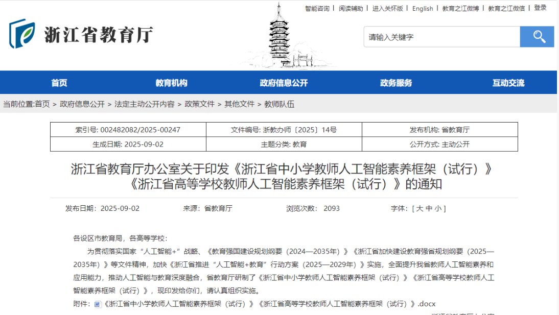 浙江省教育厅办公室关于印发《浙江省中小学教师人工智能素养框架(试行)》《浙江省高等学校教师人工智能素养框架(试行)》的通知